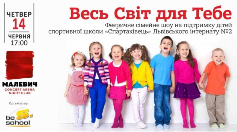 14 червня 2018р. о 17-00 у приміщенні клубу «Малевич» (пр. Чорновола,2) відбудеться благодійний концерт-шоу для всієї сім’ї «Весь світ для тебе» на підтримку дітей спортивної школи «Спартаківець» Львівського інтернату №2.