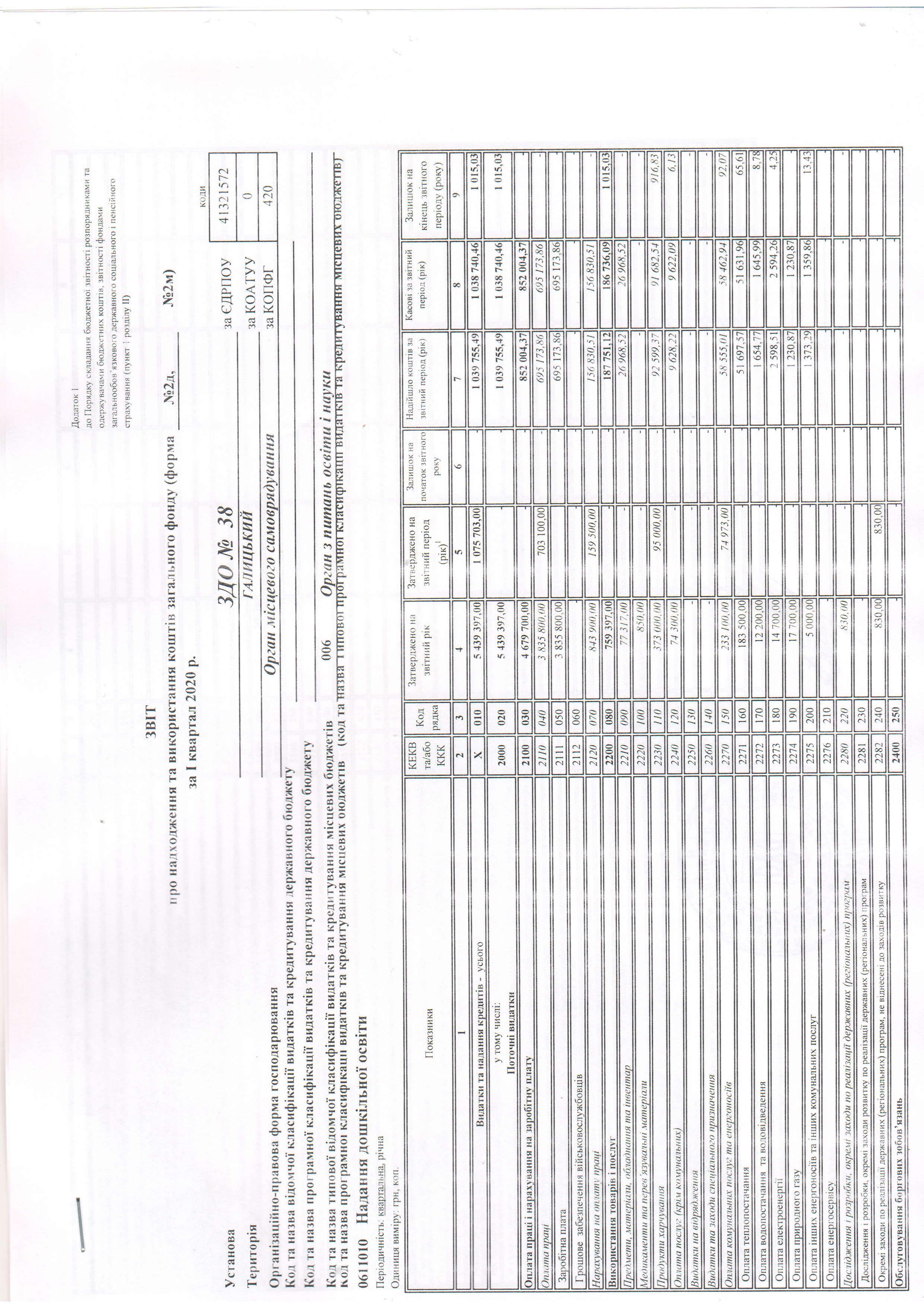Фінансовий звіт ЗДО №38 за І кв. 2020 року
